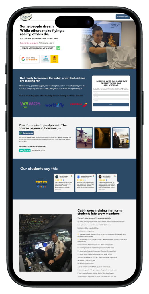 CCTC Cabin Crew Training Center is a premier aviation training institute offering comprehensive TCP courses that equip students with official cabin crew certification approved by AESA and the Ministry of Transport, Mobility and Urban Agenda. The center positions itself as a trusted pathway for aspiring cabin crew members, combining expert instruction, real-world experience, and high job placement rates to launch successful aviation careers.